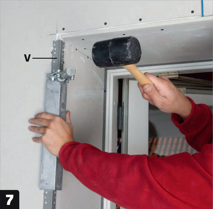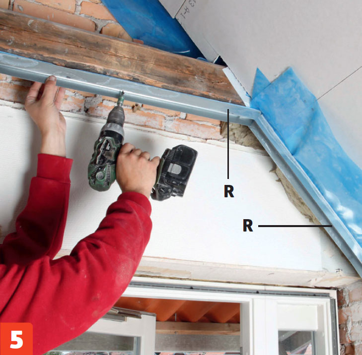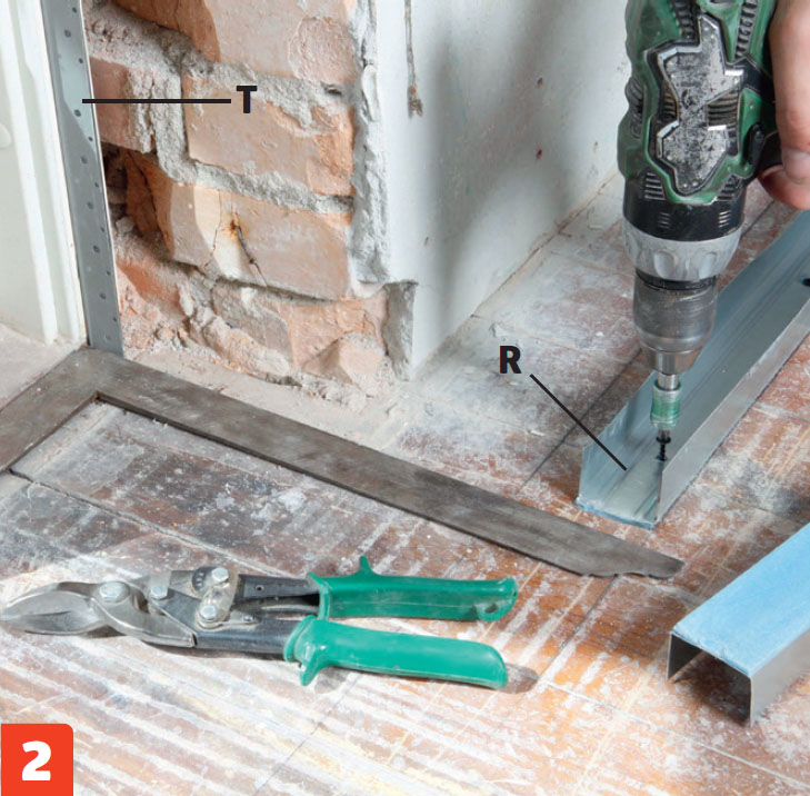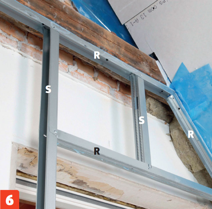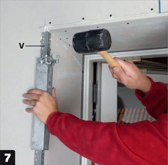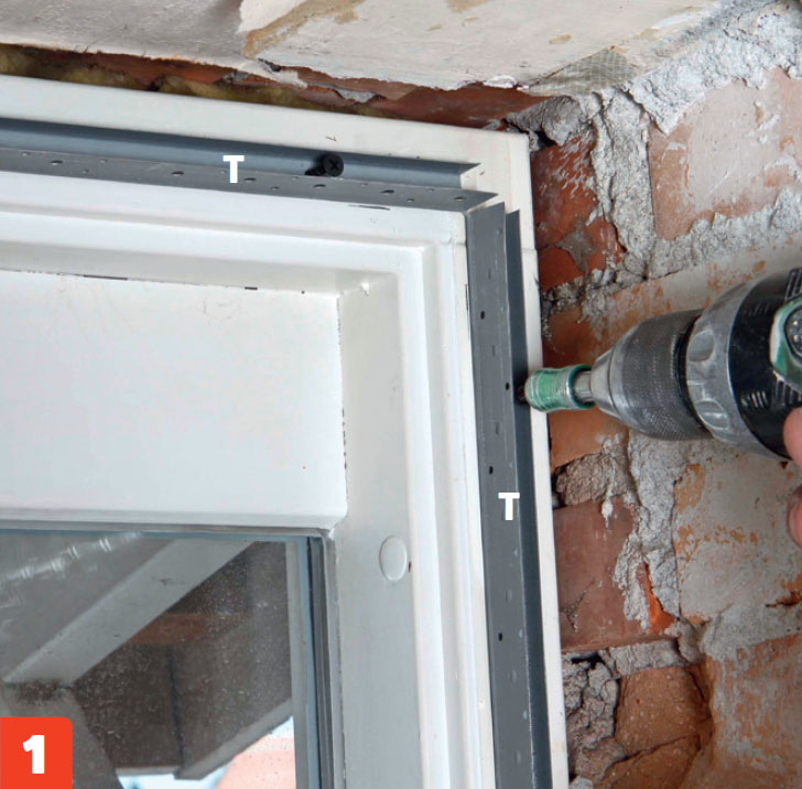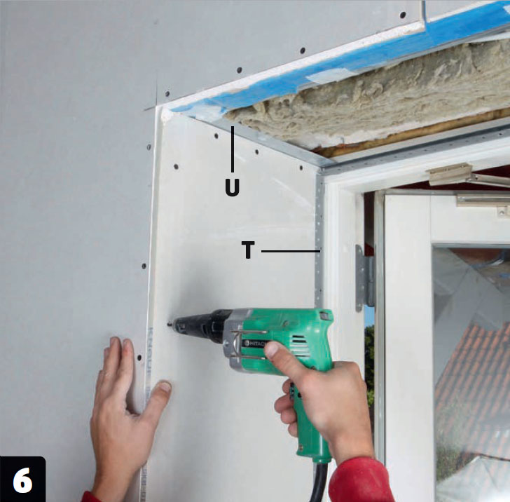 Ruuvaa teräsrangat (T) kiinni ikkunoiden ja ovien karmeihin, jotta voit asentaa kipsi levyt niiden viereen. Levyjen toisessa reunassa on ohenne tasoittamista varten.