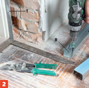 Ruuvaa alaranka (R) kiinni lattiaan. Kohdista rangan sisäreuna 11 sentin päähän seinästä ja rangan pää 2 senttiä oven vieressä olevan rangan (T) sisäpuolelle. Käytä apuna suorakulmaa.