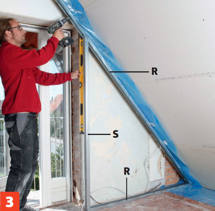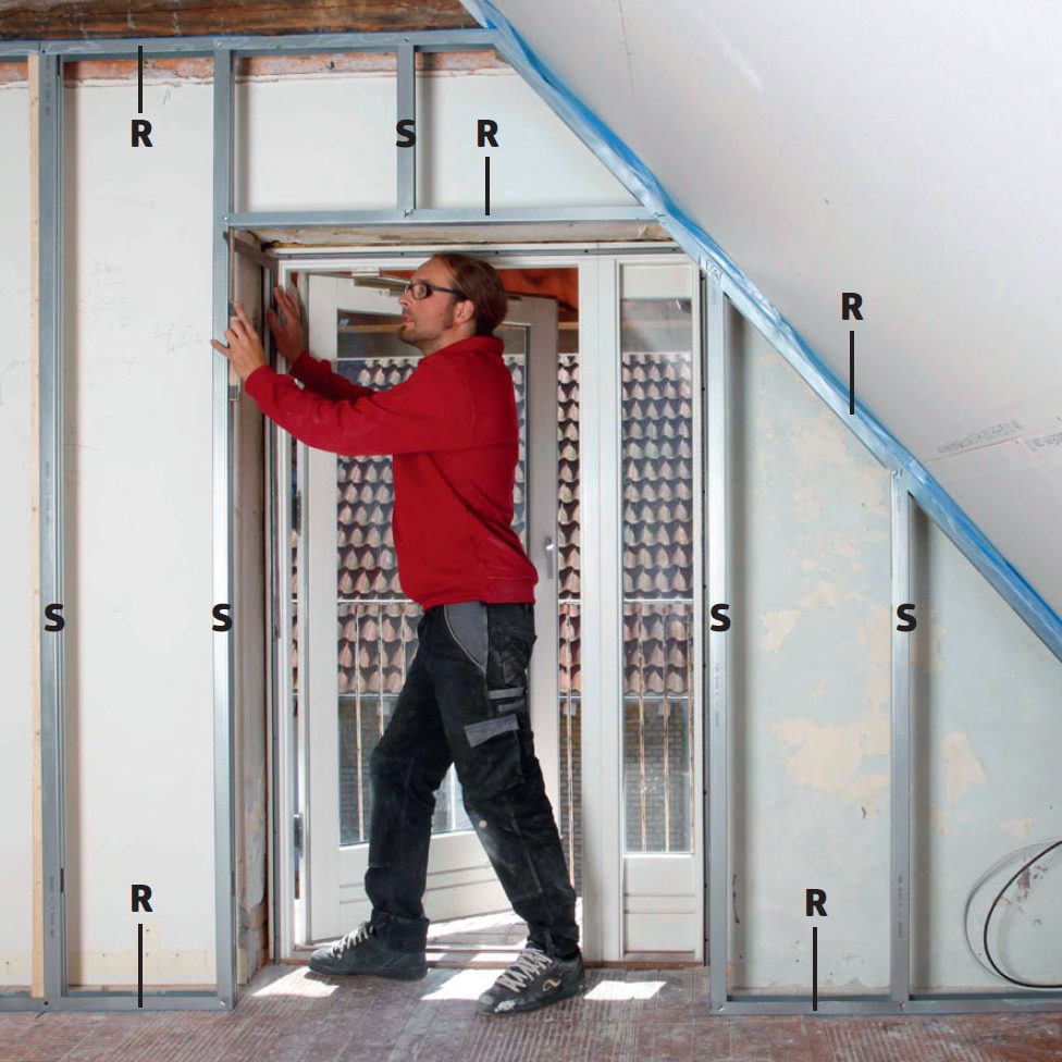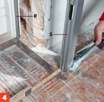 Kiinnitä pystytolppa (S) niin, että sen ja oven viereisen rangan (R) väliin jää 1,5 senttiä tilaa kipsilevyä varten.