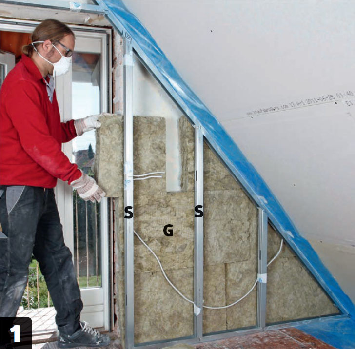 Eristä päätyseinä. Asenna aluksi 95 millin villalevyt (G) seinän ja teräsrankojen väliin ja täytä sen jälkeen tolppien (S) välit 45 millin villalevyillä. Tee levyistä noin sentin liian leveät, jotta ne pysyvät paikoillaan.