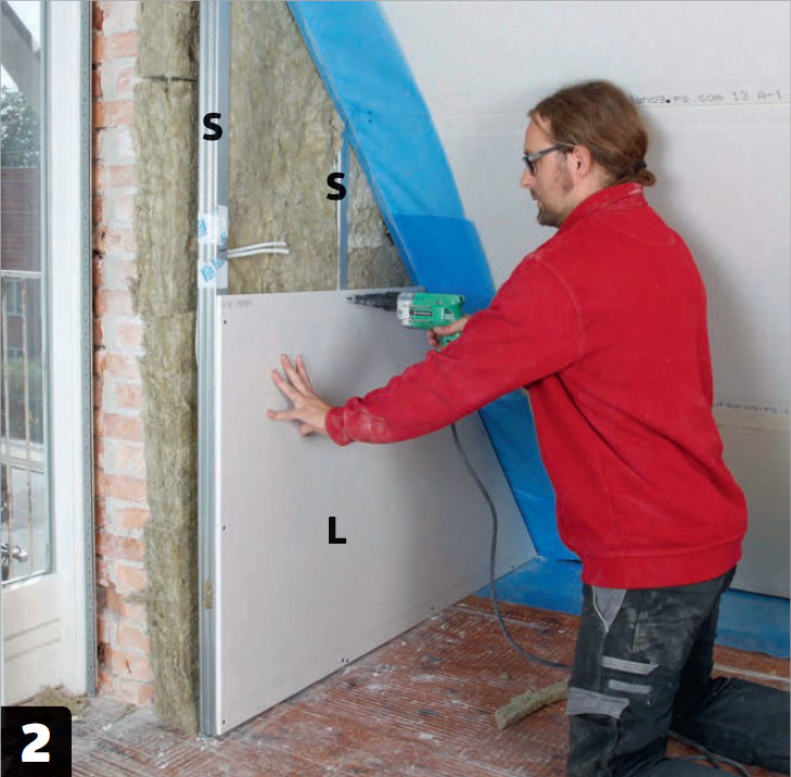 Ruuvaa alimmat kipsilevyt (L) kiinni tolppiin (S) lyhyillä kipsilevyruuveilla. Tässä levyt asennetaan vaakaan, mutta korkealla seinällä ne kannattaa asentaa pystyyn. Asenna ruuvit noin 40 sentin välein.