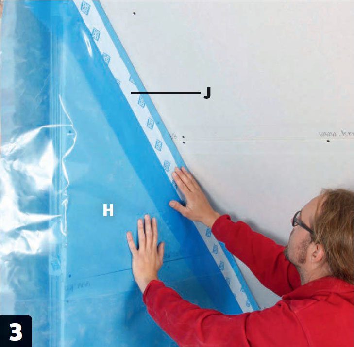 Tiivistä pääty höyrynsulkumuovilla (H). Limitä katon ja seinän höyrynsulkumuoveja vähintään 10 senttiä ja tiivistä saumat höyrynsulkuteipillä (J).