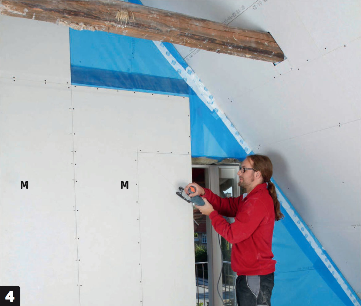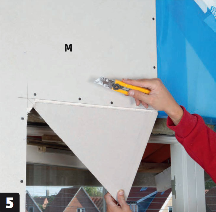 Asenna toisen kerroksen kipsilevyt (M). Asenna toisen levykerroksen ruuvit reunoille 20 sentin välein ja levyn keskelle 30 sentin välein. Tässä levy ruuvataan aluksi kiinni ikkunan viereen ja leikataan sopivaksi vasta sen jälkeen.