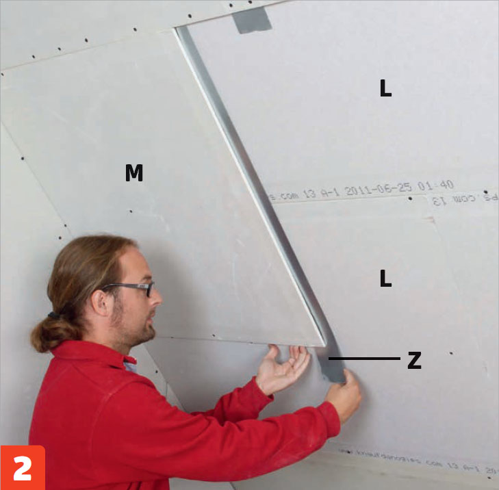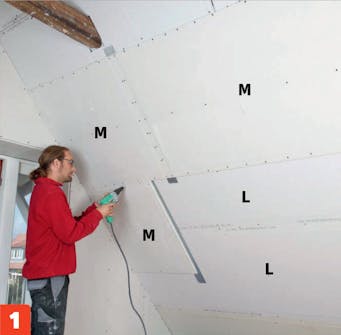 Ruuvaa toisen kerroksen kipsilevyt (M) kiinni 35 millin kipsilevyruuveilla. Asenna ruuvit levyjen reunoille 20 sentin välein ja keskelle 30 sentin välein. Limitä levyjä puolen levyn verran (L) alempiin verrattuna.