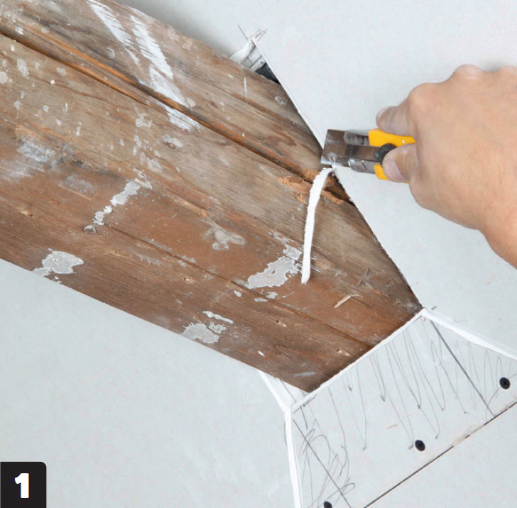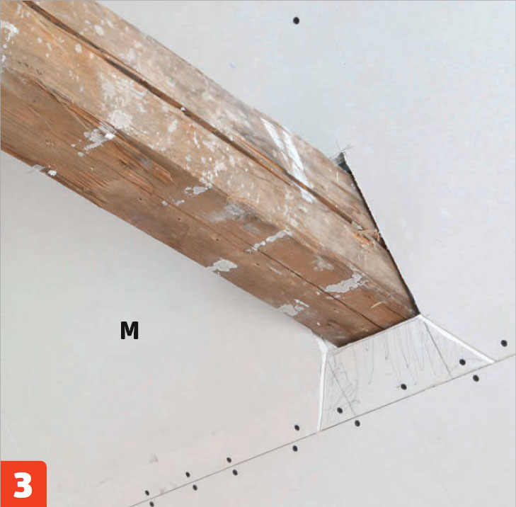 Kipsilevyyn (M) tehdään lovi kattopalkin kohdalle. Nosta levy paikalleen, piirrä palkin paikka, ota levy alas, leikkaa, nosta takaisin ja ruuvaa kiinni. Asenna aukkoon levynpala.