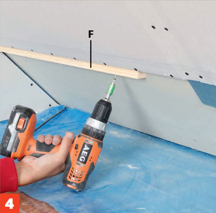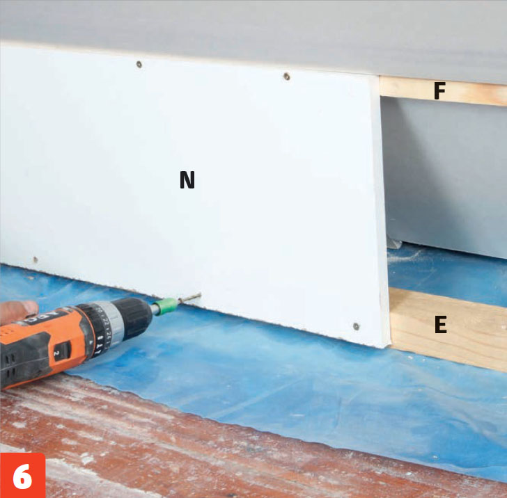Ruuvaa levy (N) kolmiorimaan (F) ja lattiarimaan (E). Tässä käytetään 30 senttiä leveää melamiinilastulevyä.