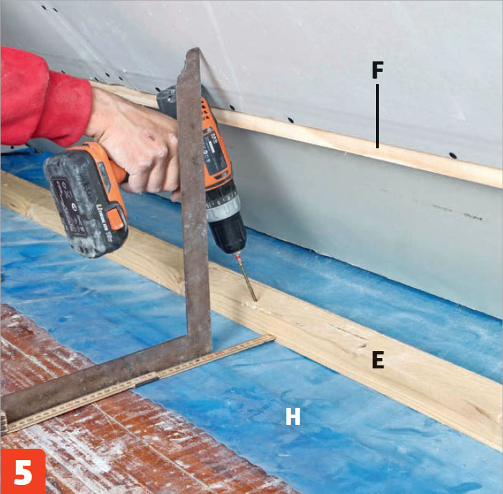 Kiinnitä kolmioriman alle lattiaan rima (E). Varmista höyrynsulun (H) tiiviys kiristämällä se lattiaa vasten, ennen kuin ruuvaat riman kiinni.