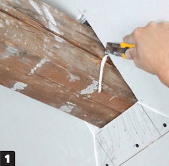 Leikkaa ylimääräinen osa pois ikkunan reunaa pitkin. Leikkaa aluksi pistosahalla viistosti nurkkaa kohti, riko sen jälkeen pintapahvi mattoveitsellä ja taita ylimääräiset osat irti.