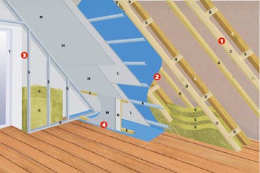 Eristeiden päälle asennetaan tiivis höyrynsulku, joka käännetään seinille, jotta ilma ei vuoda eristeisiin alempaa.