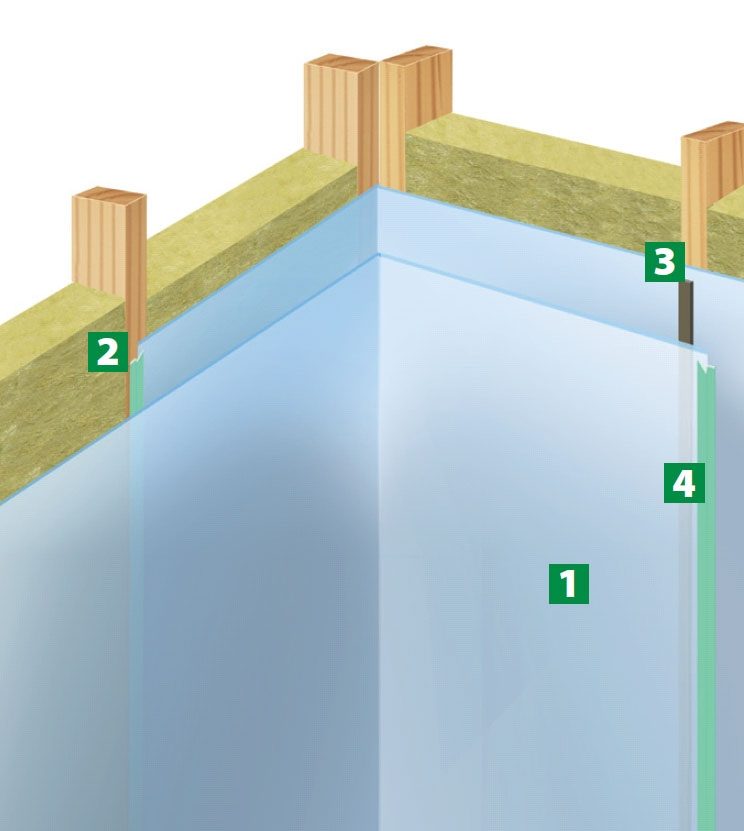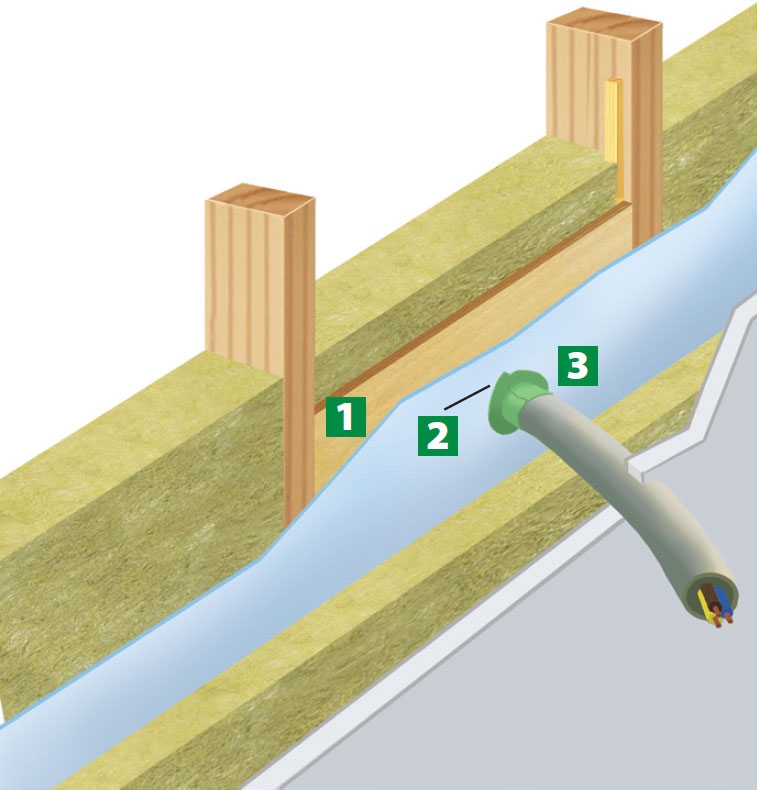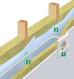 1. Jotta pistorasiat, kaapelit ja muut asennukset eivät vaatisi höyrynsulun rikkomista, sijoita höyrynsulkumuovi lämpöeristekerrosten väliin.
