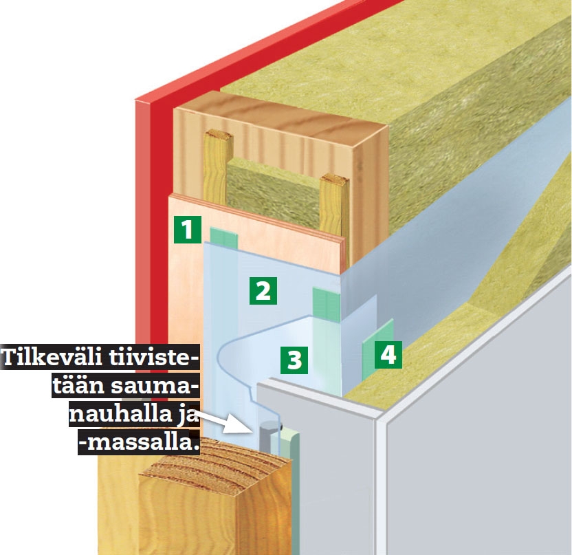 2. Höyrynsulku asetetaan eristeiden läm-pimälle puolelle (huoneen puolelle), mutta sen voi laittaa 1/3 eristepaksuuden sisään. 150 mm:n eristeessa höyrynsulku saa siis olla enintään 50 mm seinäpinnasta.