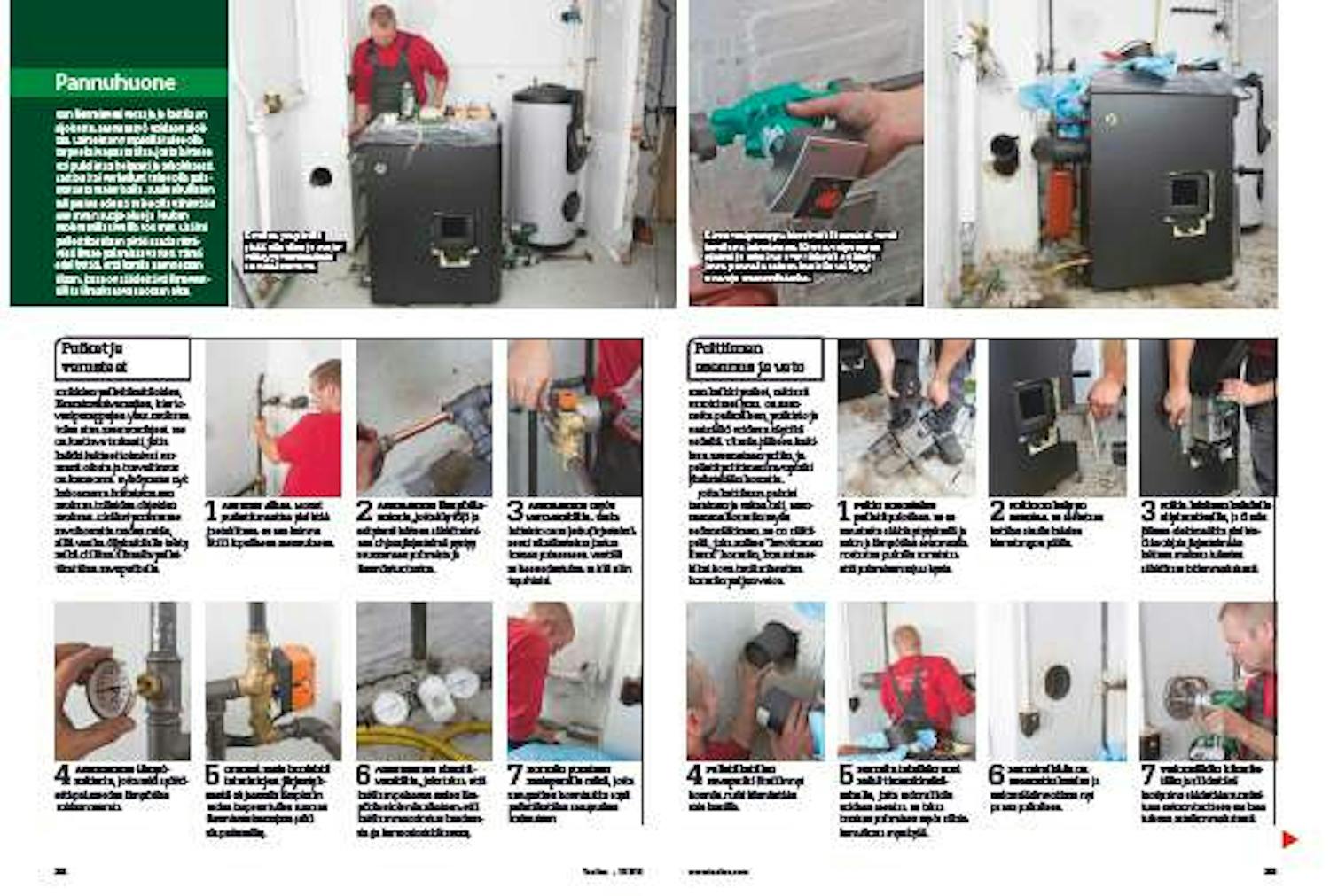Kun kaikki putket, mittarit varotoimet yms. on asennettu paikoilleen, putkisto ja vesisäiliö voidaan täyttää vedellä. Tämän jälkeen kattilaan asennetaan poltin, ja pellettipolttimen savuputki yhdistetään hormiin.