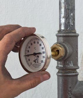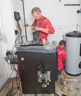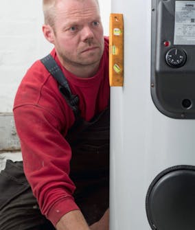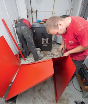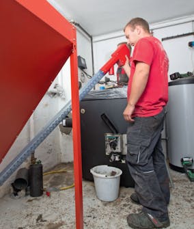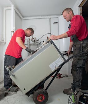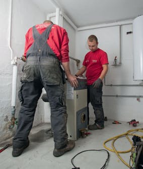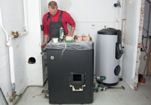 Kun tila on raivattu tyhjäksi, ryhdytään töihin. Aloitamme asentamalla uuden lämminvesivaraajan paikalleen. Valitsimme tähän kohteeseen erikoissuurikierukkaisen laitteen. Se on tehokkain, kun lämpöä siirretään polttimolta käyttöveteen. Tämän jälkeen alkaa lämminvesivaraajan ja pellettikattilan yhdistävien putkien valmistelu. Lämminvesivaraajaa ei saa kytkeä itse, vaan sen saa tehdä vain valtuutettu lvis-asentaja.