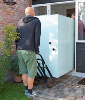Öljysäiliö siirretään ulos. 1 200 litran öljysäiliö painaa paljon. Tässä kohteessa säiliö saatiin nostettya kynnyksen yli ja pääovesta ulos.