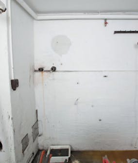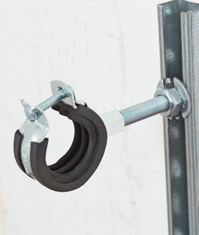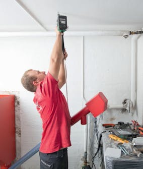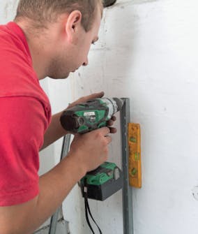 Putkikannattimien kiskot kiinnitetään kiviseinätulpilla ja ruuveilla. Pienellä vesivaa’alla tarkistetaan, että kisko tulee suoraan.