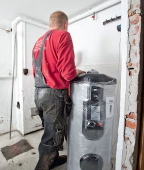 Lämminvesivaraaja asen netaan ensin. Tämä malli pystyy lämmittämään veden myös sähköllä, jos poltin sammutetaan kesäksi.