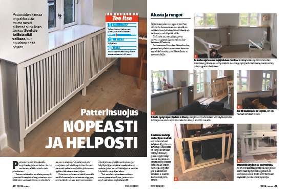 Hankalimmat paikat patterinsuojuksessa ovat nurkat. Niistä tulee mahdollisimman siistit, kun sahaat listat 45 asteen kulmassa. Sahaamiseen kannattaa käyttää katkaisu ja jiirisirkkeliä. Jos sinulla ei ole sellaista, voit käyttää myös pienihampaista käsisahaa.