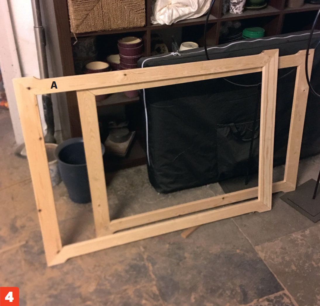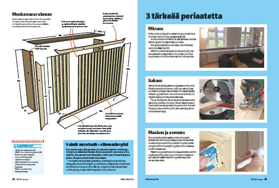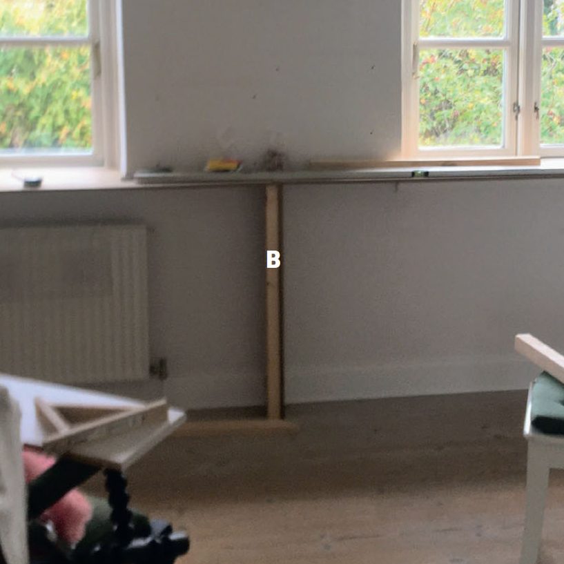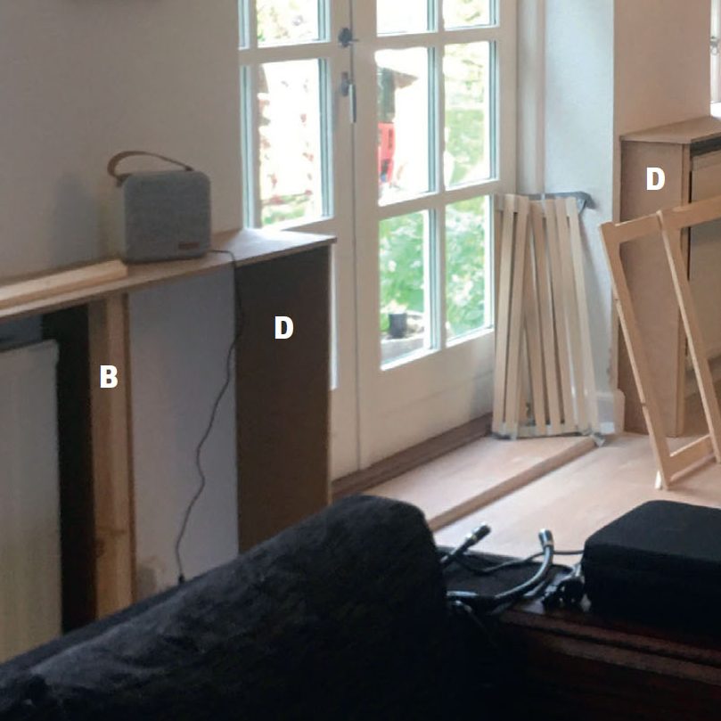 Kun ikkunalaudat ja runko (B) ovat valmiit, voit mitata tarkasti kehykset (A), joiden on tarkoitus peittää patterit. Kehykset tehdään mäntylistoista (A), joissa on pyöristetyt reunat. Ne pitää vain sahata poikki oikeasta kohdasta 45 asteen kulmassa. Kehysten ylä ja alareunaan sahataan 2-3 sentin tuuletusraot pistosahalla.