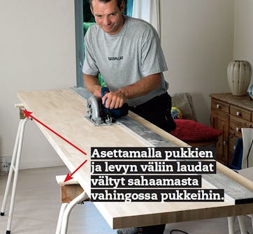 Jaa levy ensin pituussuunnassa. Suora sahausura syntyy vesivaakaa tai oikolautaa apuna käyttäen. Sahaa tämän jälkeen taso ja jalat. Me lisäämme jalkojen korkeuteen 10 cm, jotta ilmalle jää riittävästi tilaa kiertää.