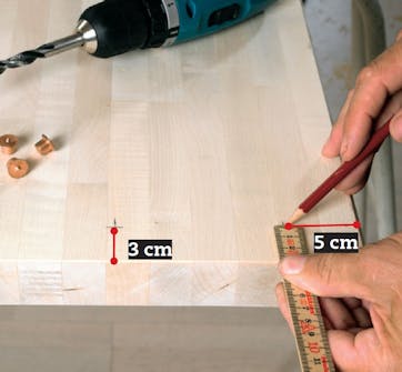 Mittaa tasoon kolmelle tapille paikat. Uloimmat tapit sijoitetaan 5 cm:n päähän reunasta molemmin puolin. Tämä puulevy on 4 cm paksu, joten tapit sijoitetaan 3 cm:n päähän päätyreunasta (puoli levyn paksuutta + 1 cm).