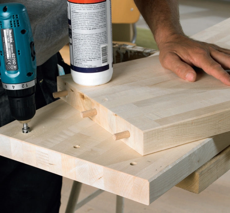 Yhdistä jalat ja taso. Reikiä kannattaa hiukan upottaa levyyn, jotta tapit saa helpommin paikoilleen. Tapit liimataan ensin jalkoihin ja sen jälkeen tasoon. Muista laittaa liimaa myös tasossa oleviin tapinreikiin.