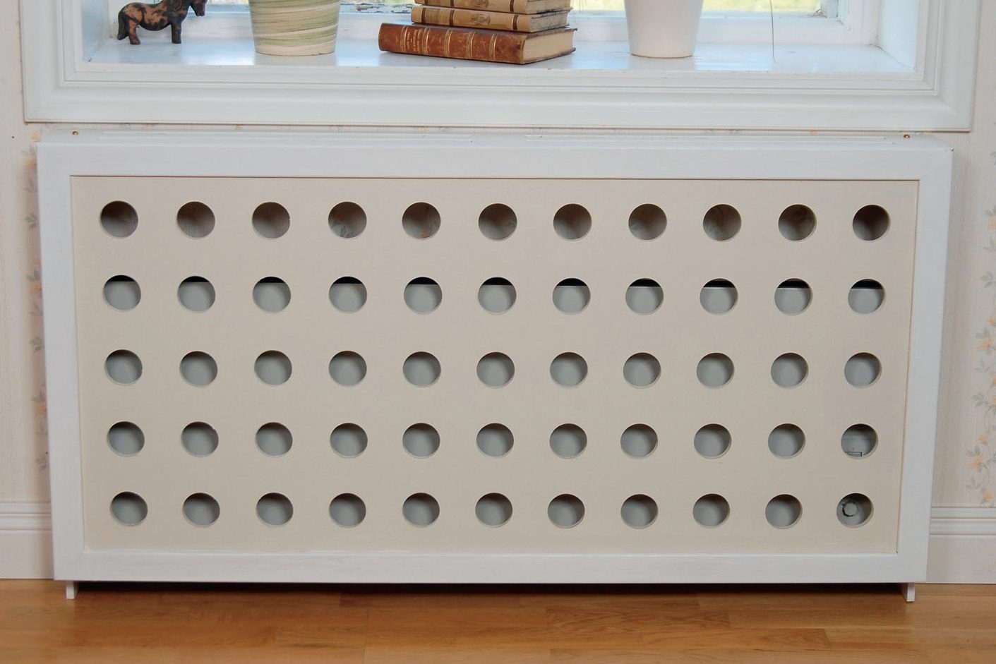 Tässä piilotamme vesikiertopatterin apilakuvioisen, koristeellisen metallilevyn taakse. Ilman on saatava kulkea vapaasti myös patterin ylä- ja alapuolilta, vaikka suojuslevy onkin täynnä pieniä reikiä. Lattiaa vasten on oltava vähintään