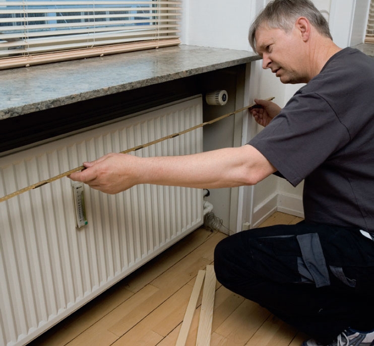 Mittaa ja tarkista lattian suoruus ennen kuin päätät jalkojen korkeuden. Jos lattia on epätasainen, laita vesivaa’an alle pieni pala. Kun lisäät tämän palan paksuuden jalkojen korkeusmittaan, saat patterin suojuksen vaateriin.
