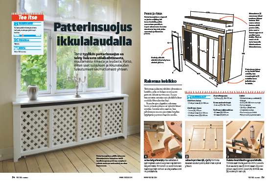 Patterinsuojuksesta tehdään yhtenäinen laatikko, joka on helppo nostaa pois patterin edestä tarvittaessa. Suojus kiinnitetään seinään vain yhdellä kulmaraudalla ikkunalaudan läpi.
