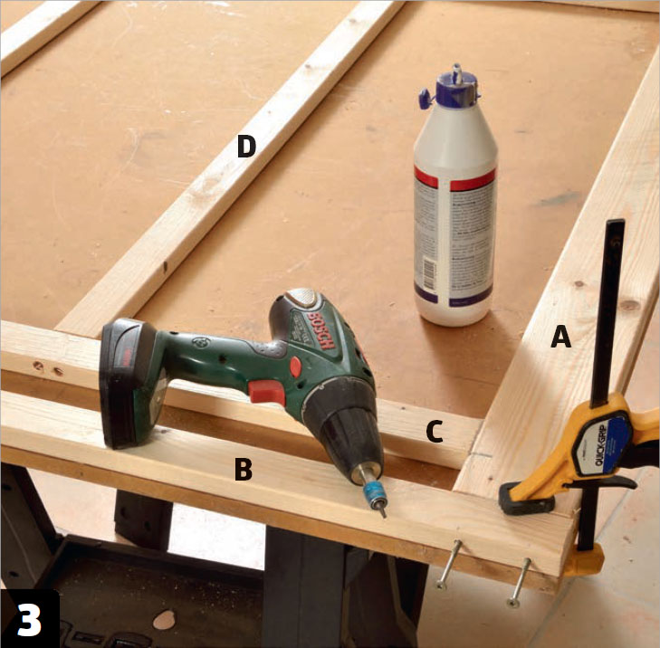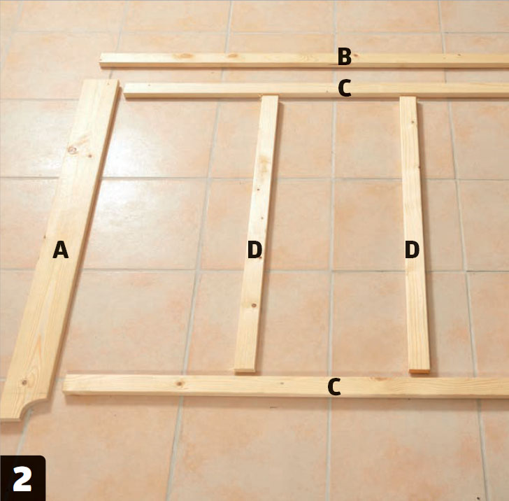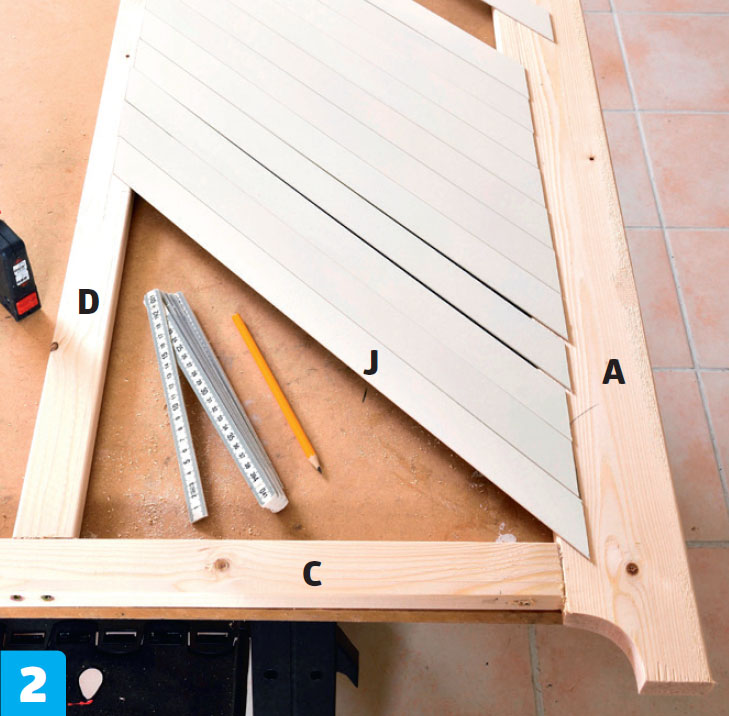 Mittaa kehikon leveys ja asenna ensimmäinen säle (J) viistoon osien (A) ja (D) väliin. Levitä loput pitkät säleet sen viereen ja kiinnitä joka toinen liimalla ja hakasilla.