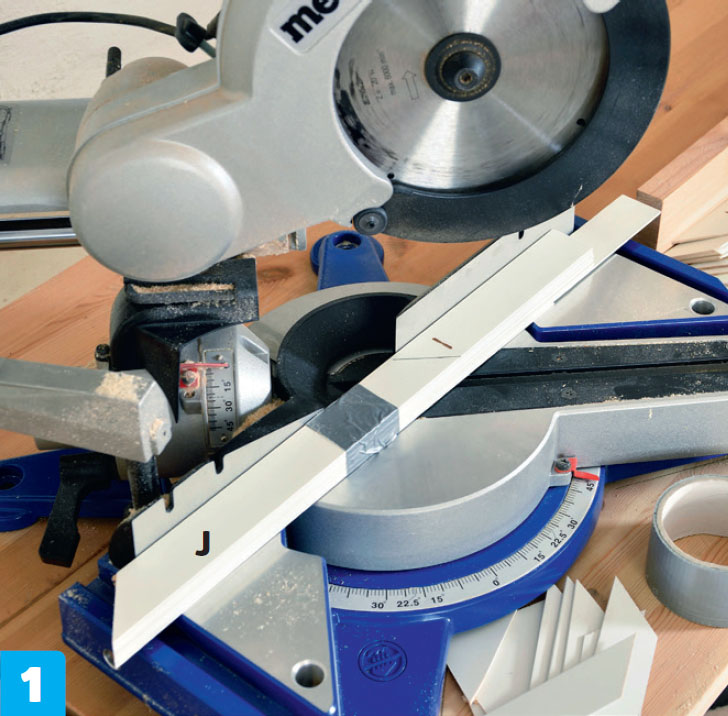Sahaa säleet (J) poikki viistosti katkaisu- ja jiirisirkkelillä, jotta kulmista tulee yhtä jyrkät. Voit sahata useamman säleen kerralla, kun teippaat ne yhteen.