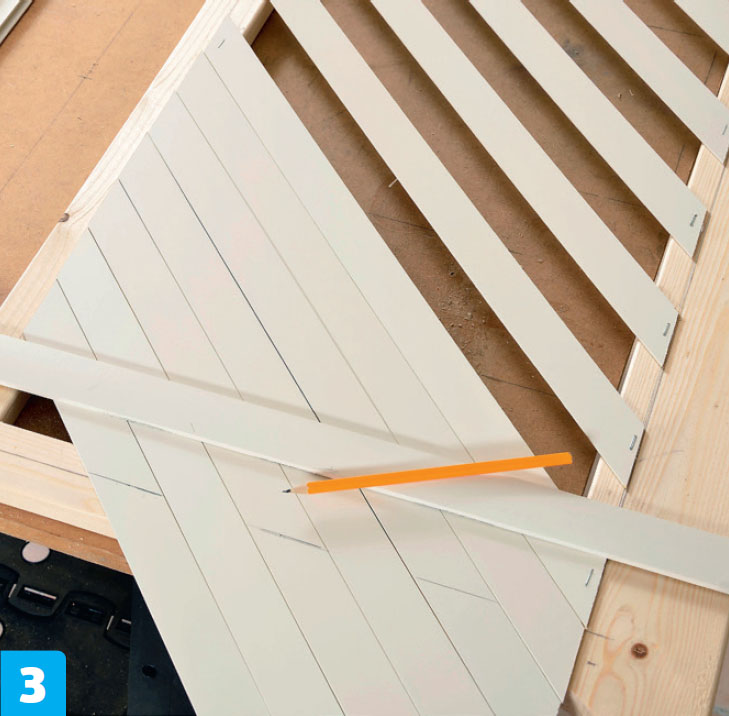 Merkitse lyhyiden säleiden mitat yksitellen. Täytä kehikko kokonaan säleillä ja piirrä viivat joka toiseen säleeseen.
