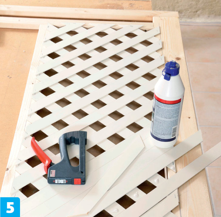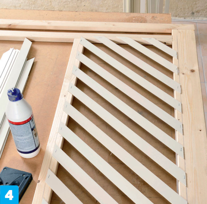 Asenna toinen sälekerros ensimmäisen päälle. Levitä tilkka puuliimaa alempien säleiden päälle kiinnityskohtiin. Säädä toisen kerroksen säleet kohdilleen ja kiinnitä ne hakasilla.