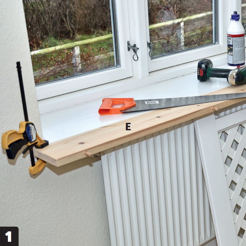Purista ikkunalauta (E) kiinni vanhaan ikkunalautaan ja poraa asennusruuveille valmiit reiät siten, että ruuvinkannat uppoavat ikkunalaudan puoliväliin. Ruuvaa ikkunalauta kiinni vanhaan ikkunalautaan 5x120 millin ruuveilla ja peitä kolot tapeilla.