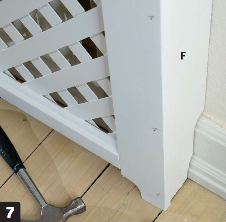 Liimaa ja naulaa reunalevyt (F) kiinni kehykseen 1,8x40 millin nauloilla. Naulaa varovasti, jotta etupuolelle ei tule rumia koloja. Nyt laatikko on valmis, ja sen voi asentaa paikalleen.