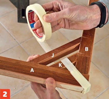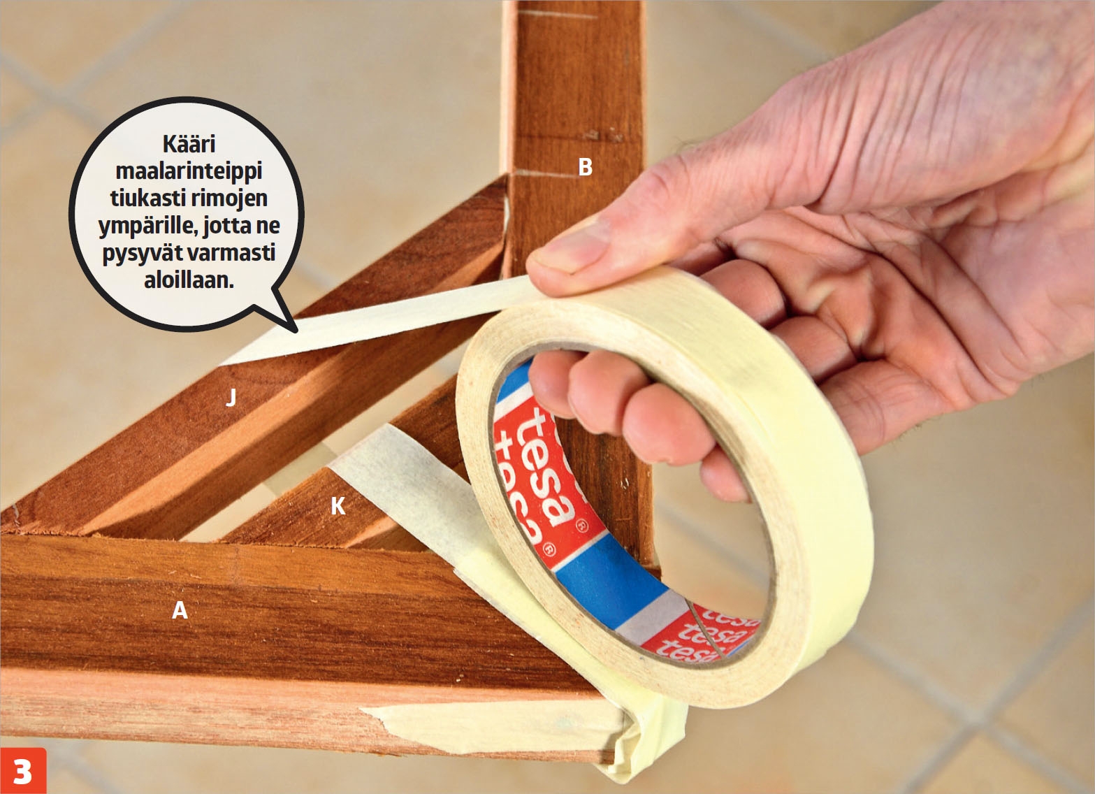 Seuraavaksi rimat liimataan kiinni runkoon. Sen voi tehdä helposti kiertämällä maalarin teippiä jokaisen riman ympärille. Siten rimat pysyvät paikallaan sen aikaa, kun liima kuivuu.
