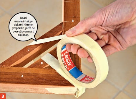 Rima pysyy nyt varmasti paikallaan. Levitä liimaa seuraavan riman päihin. Aseta rima paikalleen ja pyöritä teippi sen ympäri.