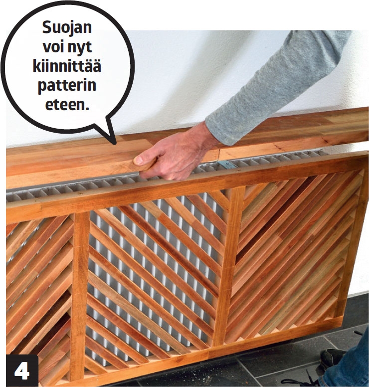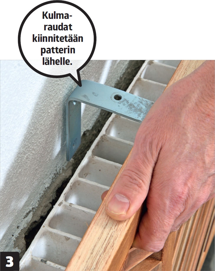 Suoja ripustetaan patterin eteen parin kulmaraudan avulla. Mittaa, kuinka pitkiä kulmarautojen pitää olla, jotta ne yltävät patterin ylitse.