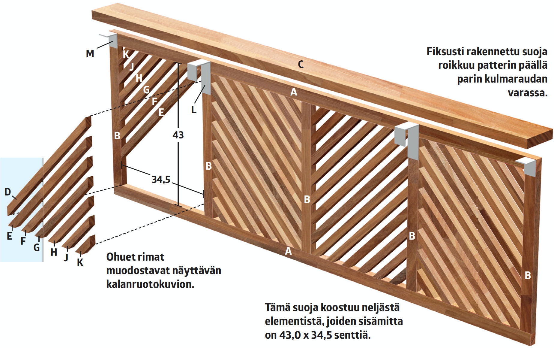 Suojan rakentaminen aloitetaan 7-osaisen rungon kokoamisesta. Tee elementtien runkojen osista 35 milliä leveät. Muista porata reiät valmiiksi, jotta osat eivät halkea ruuvattaessa.
