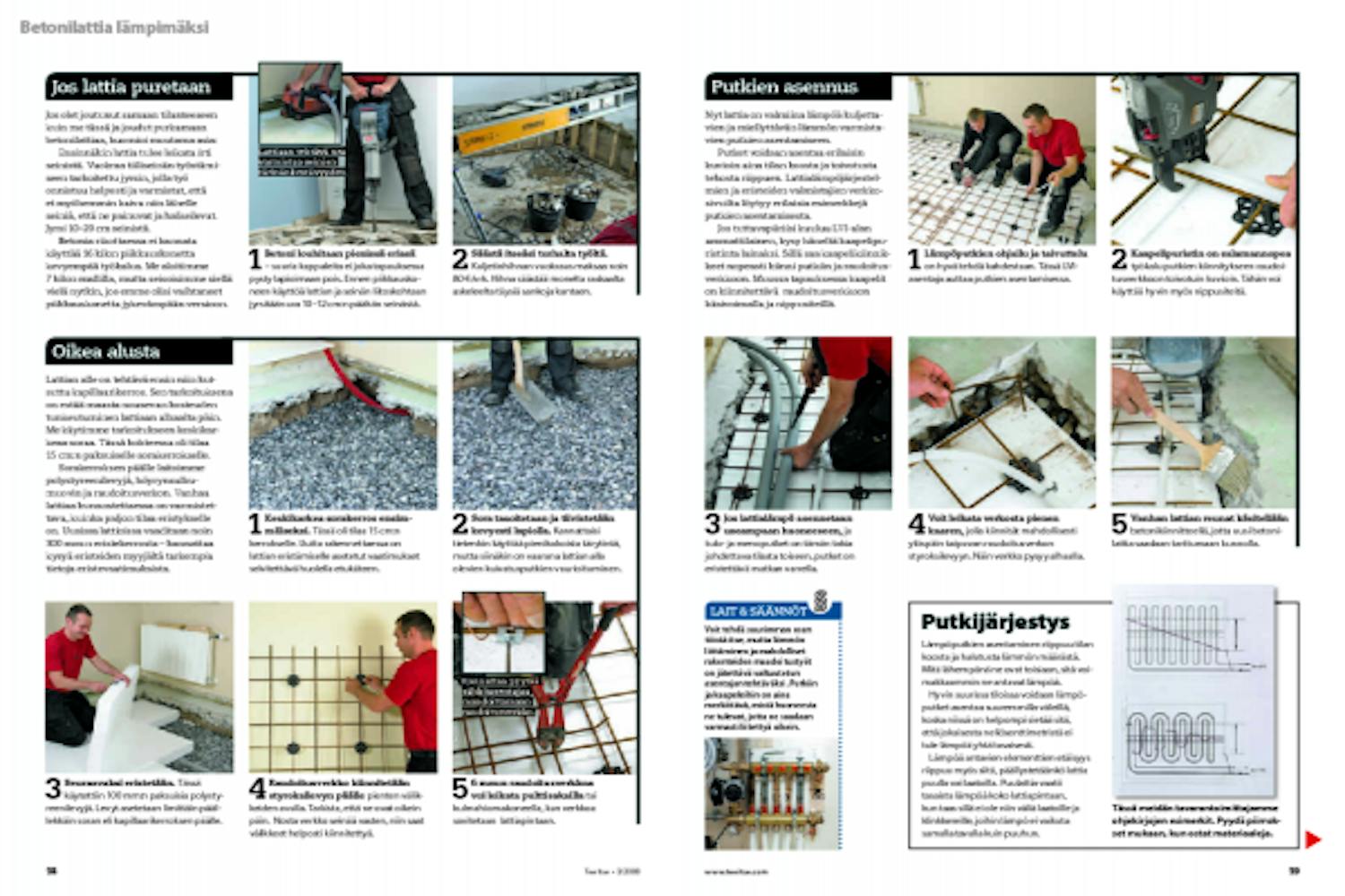 Tämän jutun lähtökohta oli hieman epätavallinen: kosteusvaurion kär-sinyt kellari, jonne haluttiin kuiva-tusjohdot, jonka vuoksi koko lattia oli purettava. Näin ollen ajatus lattialämmi-tyksen asentamisesta ei enää ollut niin kaukaa haettu, kun koko lattia jouduttiin joka tapauksessa valamaan uudelleen. Lattialämmitys asennetaan pitkälti samalla tavalla riippumatta siitä, onko kyseessä asennus vanhan betonilattian alle vai uuden lattian valaminen kylpy-huoneeseen, lisärakennukseen, olohuo-neeseen, keittiöön tai kellariin.