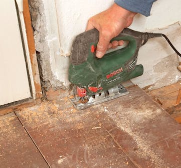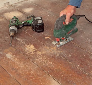 Lattian poraamisessa on niksin-sä. Poraa reikä yhteen laudoista ja sahaa lauta pistosahalla. Jos osut poratessa kannattimeen, poraa toiseen kohtaan.