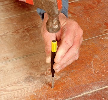Nyt voit ryhtyä nostamaan lattialautoja ylös toisesta päästä. Vedä naulat kannattimista ulos sorkkaraudalla, ja poista vanha eriste.