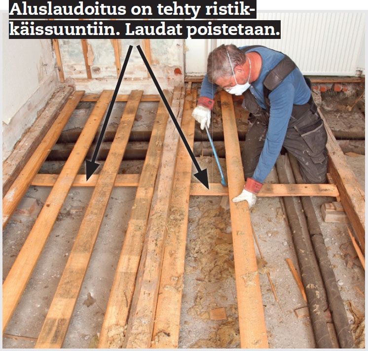 Vanhoihin taloihin asennettiin usein lattia ennen seinien rappausta. Tämän vuoksi voit joutua sahaamaan lautoja hieman seinän vierus-talta, jotta saat kitkuteltua ne irti.