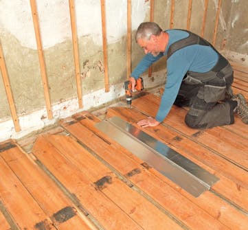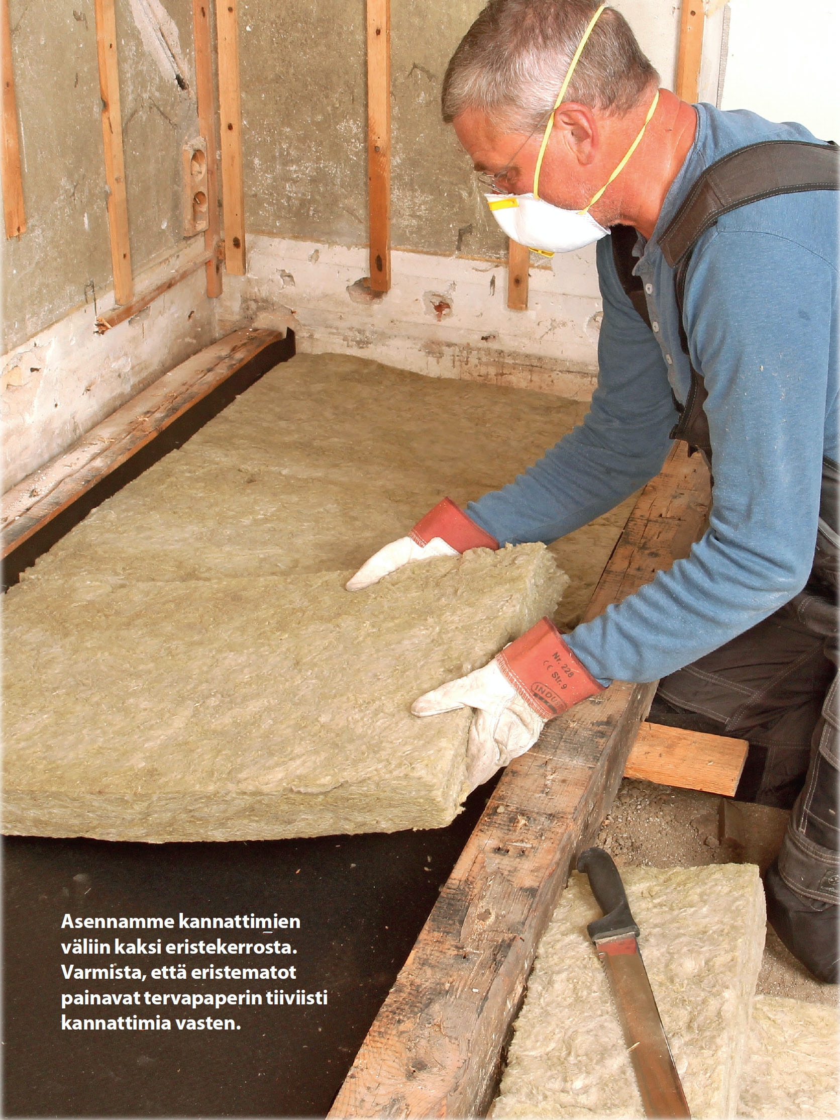Jotta lattialämmitys toimisi tehokkaasti, lattia eristetään. Vanhat eristeet poistetaan ja uusi eristekerros asennetaan. Aloita kiilaamalla kannattimet, jos tar-peen, ja kiinnitä muutamia vanhoja lautoja aluslaudoitukseksi poikittain kan-nattimien alle. Jos vanhoja lautoja ei ole, käytä 19 x 100 mm:n sahalautoja. Asenna lautojen päälle tuulensuojapa-peri ja kiinnitä se sinkilöillä kannatti-miin ja PU-vaahdolla seinään.