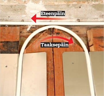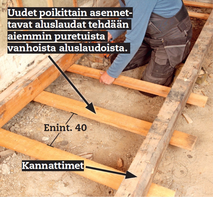 Pex-putkia kannatteleva aluslaudoi-tus tehdään alkuperäisistä lattia-laudoista. Ne sahataan nyt toisesta pääs-tään viistoon, jotta putket voivat kulkea lautojen päädyssä seinustalla.