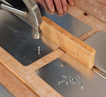 Paina 20 mm paksu välike kahden levyn väliseen liitokseen, jotta levyt asettuvat oikein. Iske levyn molempiin päihin huopanaulat. Naulat kiinnitetään vain yhteen levyyn, jotta levyjen alla oleva lattia voi elää vapaasti.