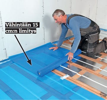Levitä höyrynsulkukaistaleet lattiaan vähintään 15 cm:n limityksellä. Käytä 0,2 mm:n höyrynsulkumuovia.