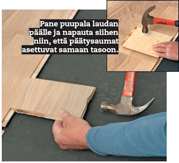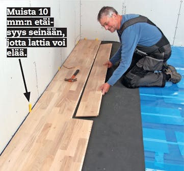 Laudat asennetaan vasemmalta oikealle, muussa tapauksessa niitä ei voi napsauttaa yhteen päätysaumoista. Limitä saumoja vähintään 50 cm, jotta ne ei vät osu samaan kohtaan vaan limittyvät juoksevasti. Muista jättää rakoa seinään.