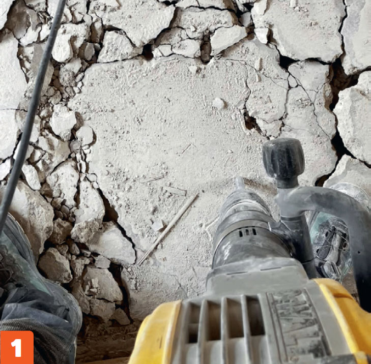 Maanjäristys? Koko lattia on purettu palasiksi piikkauskoneella. Nyt ne pitää saada ulos vaihtolavalle. Se on työn raskain vaihe, jossa kannattaa käyttää apuna koneita. Voit vuokrata esimerkiksi hihnakuljettimen ja moottorikärryn.