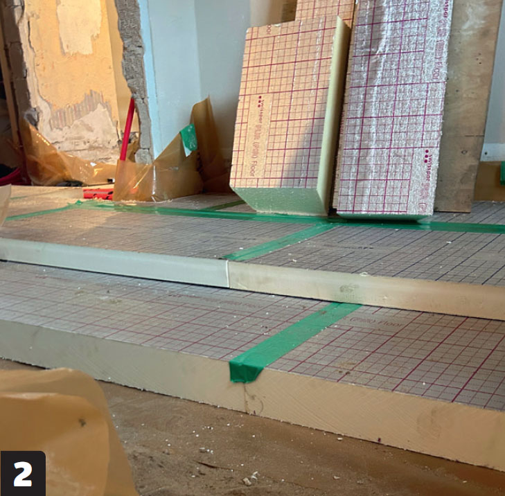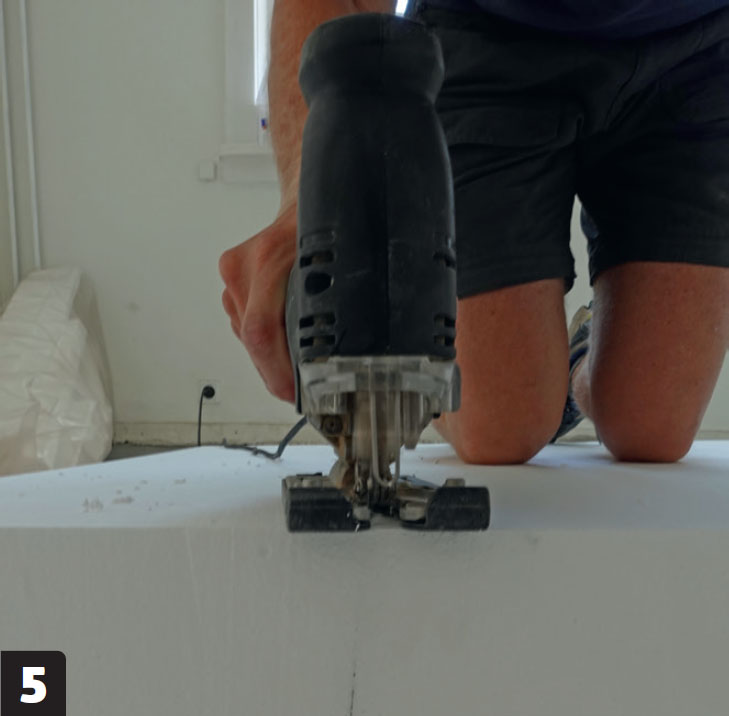 Asenna eristelevyt. Alemmman kerroksen levyt ovat 10 senttiä ja ylemmät 5 senttiä paksuja. Kaikki saumat tiivistetään höyrynsulkuteipillä.