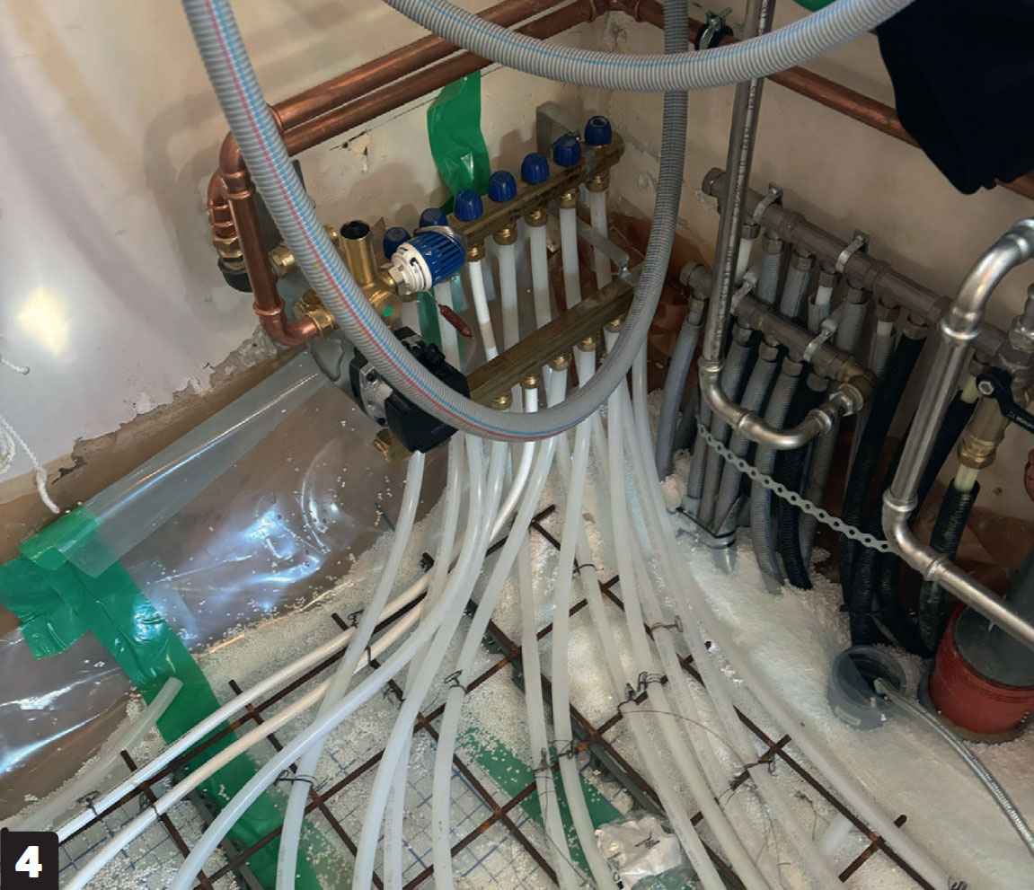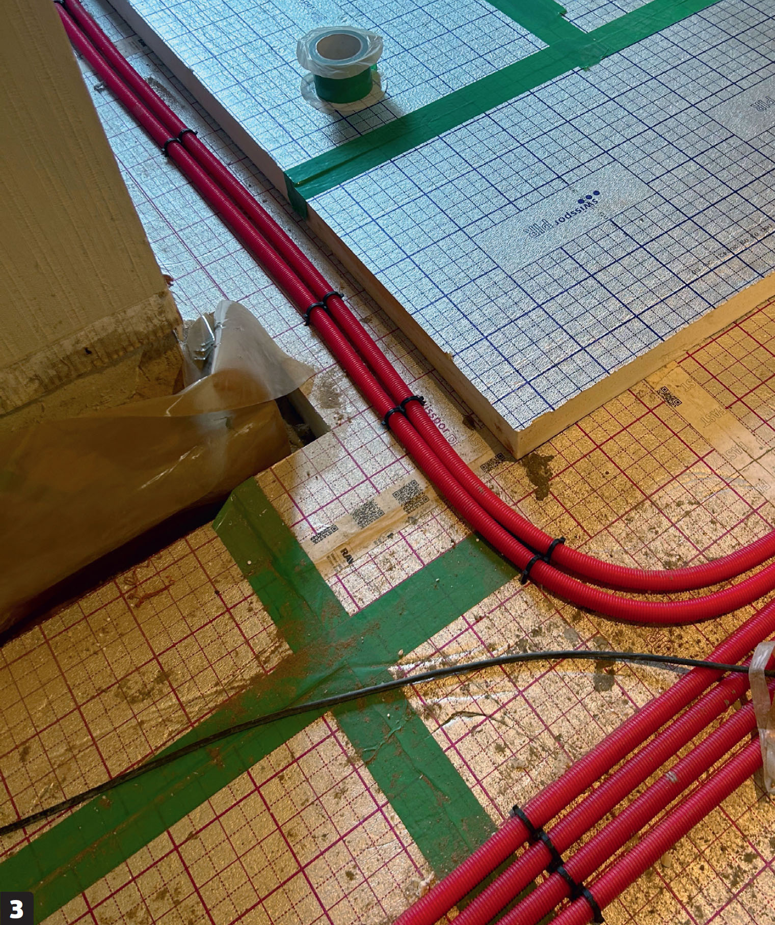 Kun verkot on asennettu, on aika kiinnittää niihin lattialämmitysletkut. Näin isoon lattiaan pitää tehdä useita lämmityspiirejä. Yhden piirin pituus saa olla korkeintaan sata metriä.